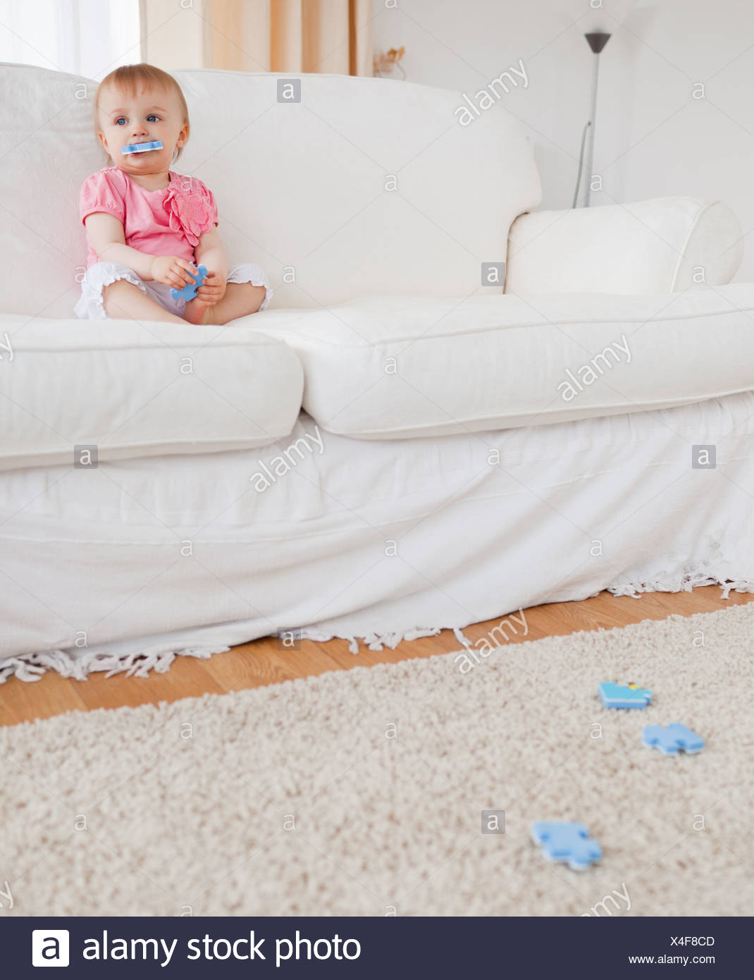 Cute Blond Baby Playing With Puzzle Pieces While Sitting On A Sofa