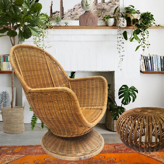 Vintage Rattan Egg Chair Swivel Wicker Pod Boho Club Chair Etsy