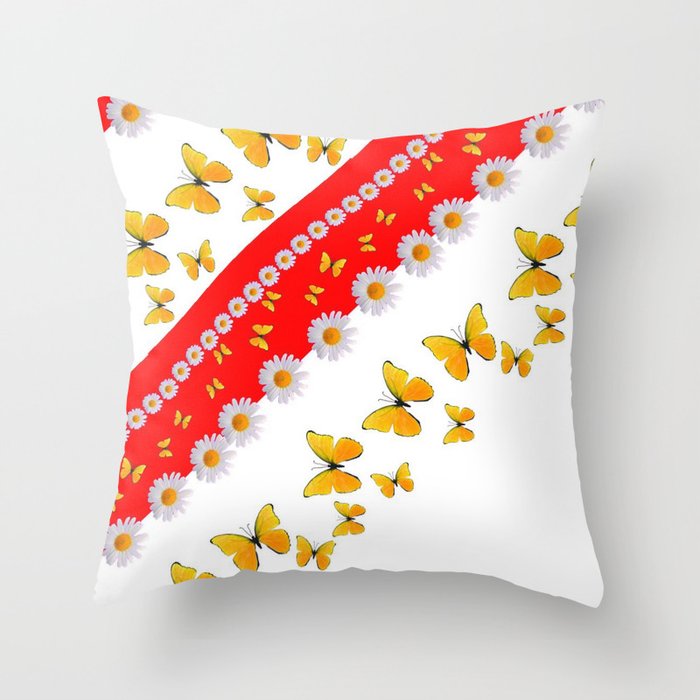 Red Modern Art Yellow Butterflies White Daisies Throw Pillow By