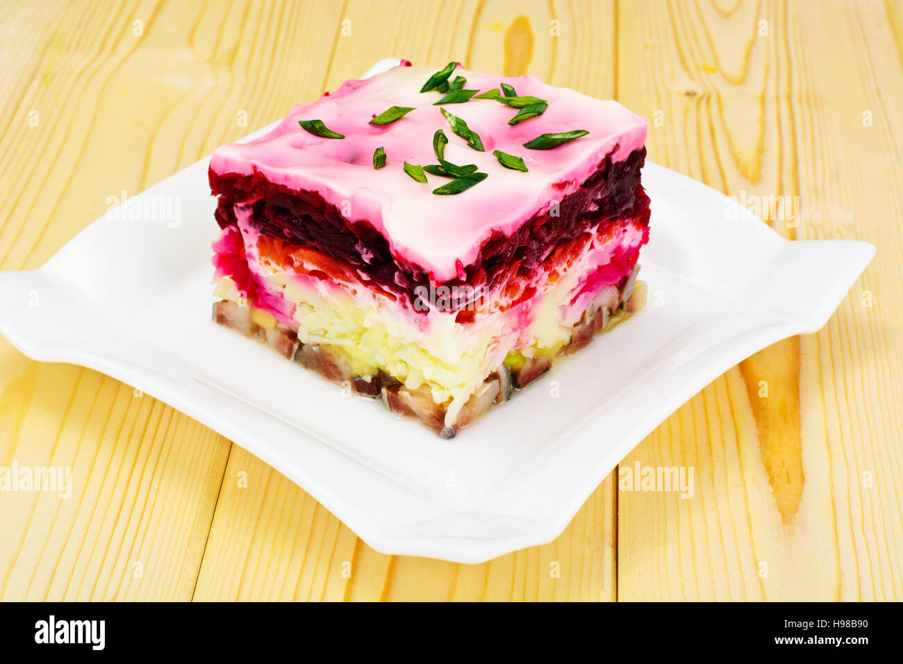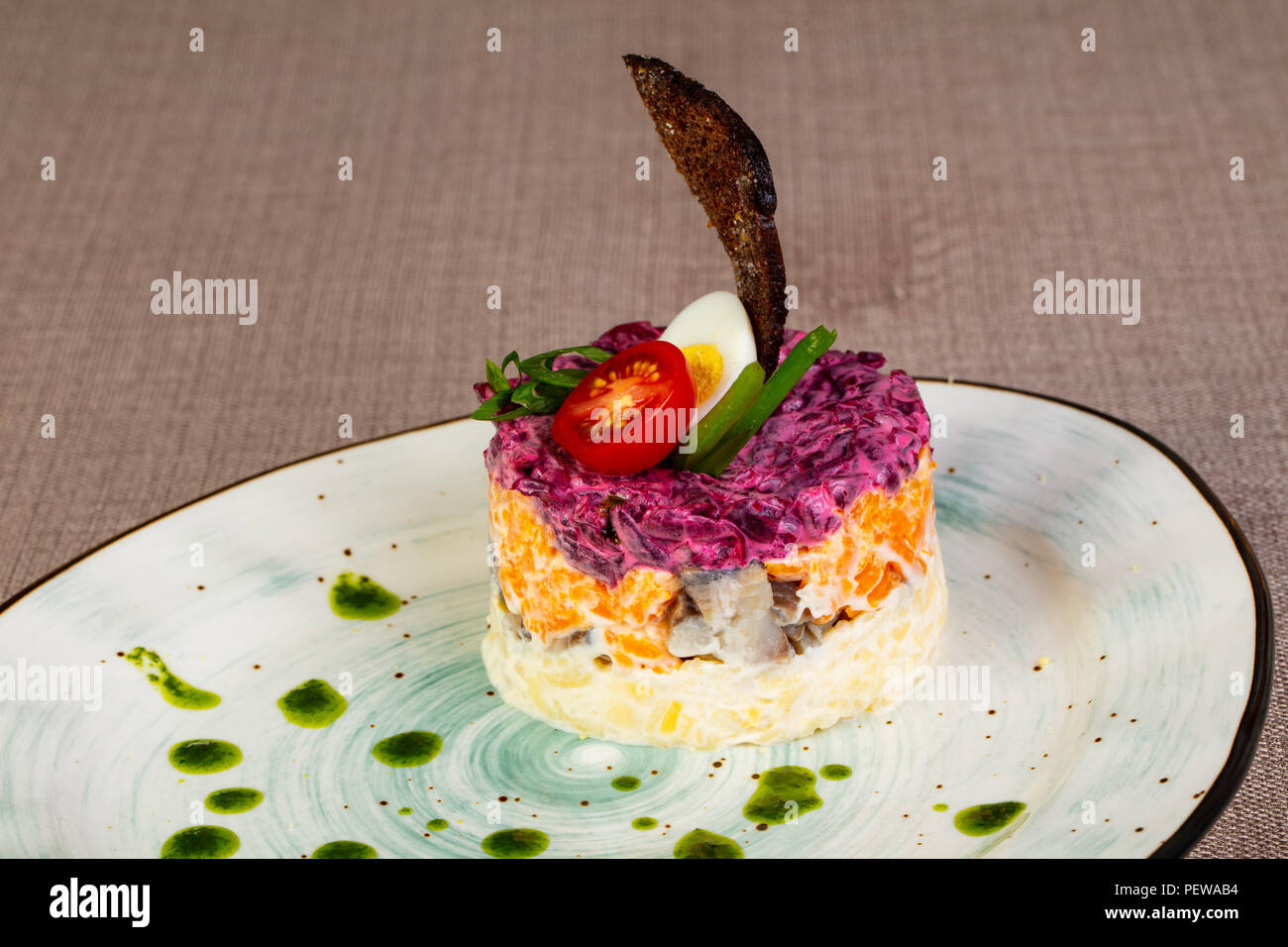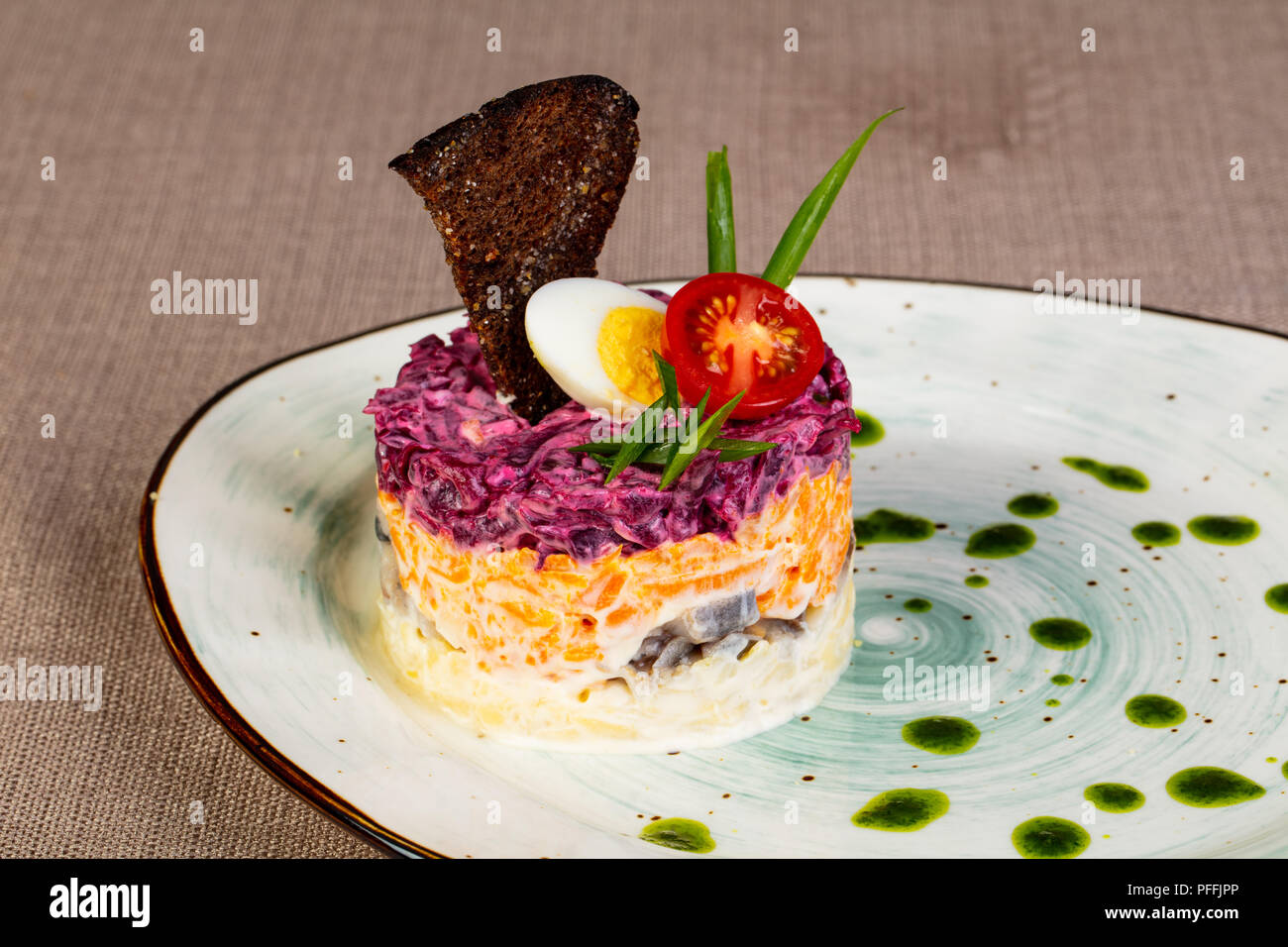Russische Traditionelle Salat Mit Hering Und Rote Bete Stockfoto